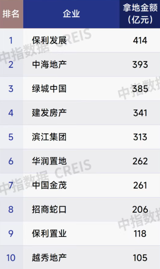 十强拿地房企变动较大,其中第7到第10的中国金茂、招商蛇口、保利置业和越秀地产上一年都未进入前十。它们取代了中建壹品(上年第2)、海开控股(上年第6)、中建智地(上年第9)和中国铁建(上年第10)。