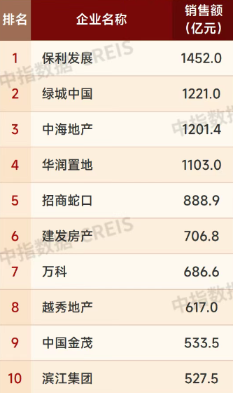 十强企业的席位与上一年相比几乎没有变化,只有上年排名第10的龙湖跌出榜单,由中国金茂接替(上年第12)。十强企业中,只有建发房产、越秀地产和中国金茂的销售额与去年同期相比有所提升。